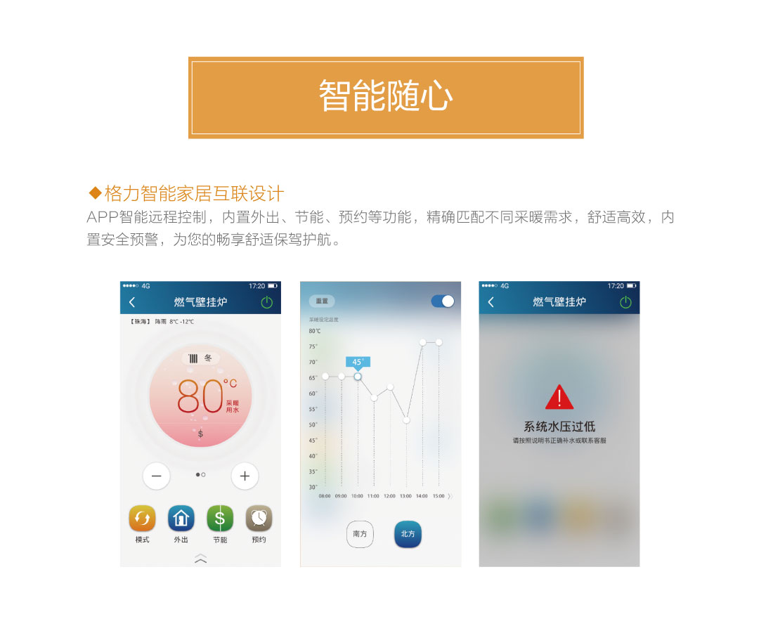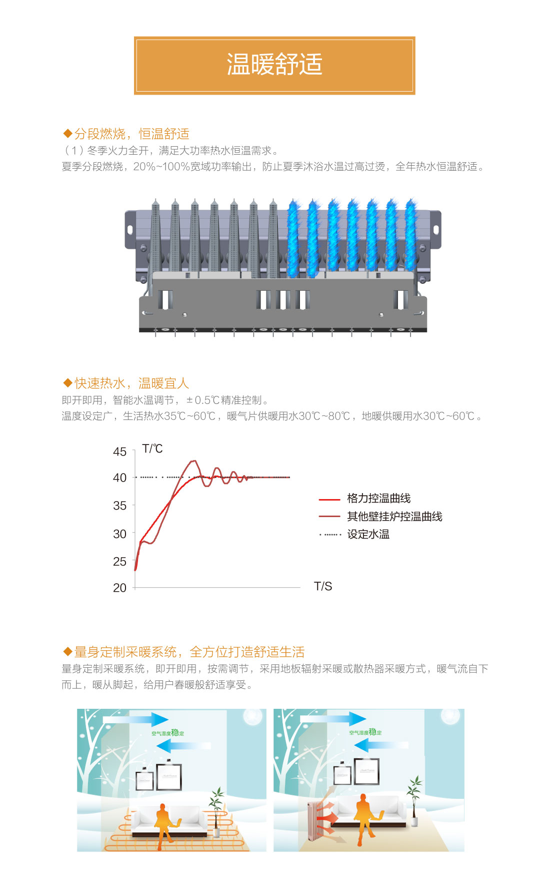 分段燃烧,20%~100%宽域功率输出,防止夏季水温过高过烫,智能水温调节,±0.5℃精准控温,温度设定广,生活热水35℃~60℃,暖气片供暖用水30℃~80℃,地暖供暖用水30℃~60℃